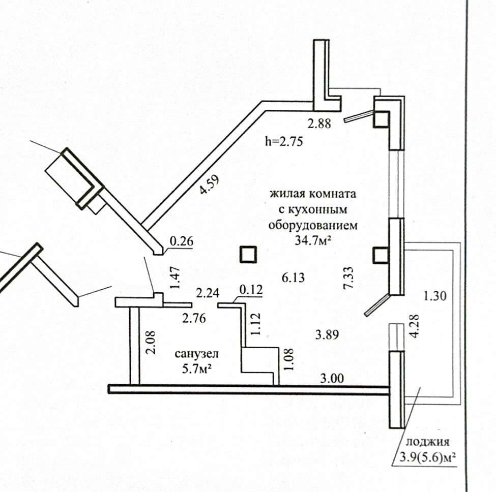 Общая площадь снб 44,3/жилая с кухонным оборудование 34,7кв, высокие потолки 2,75 м.