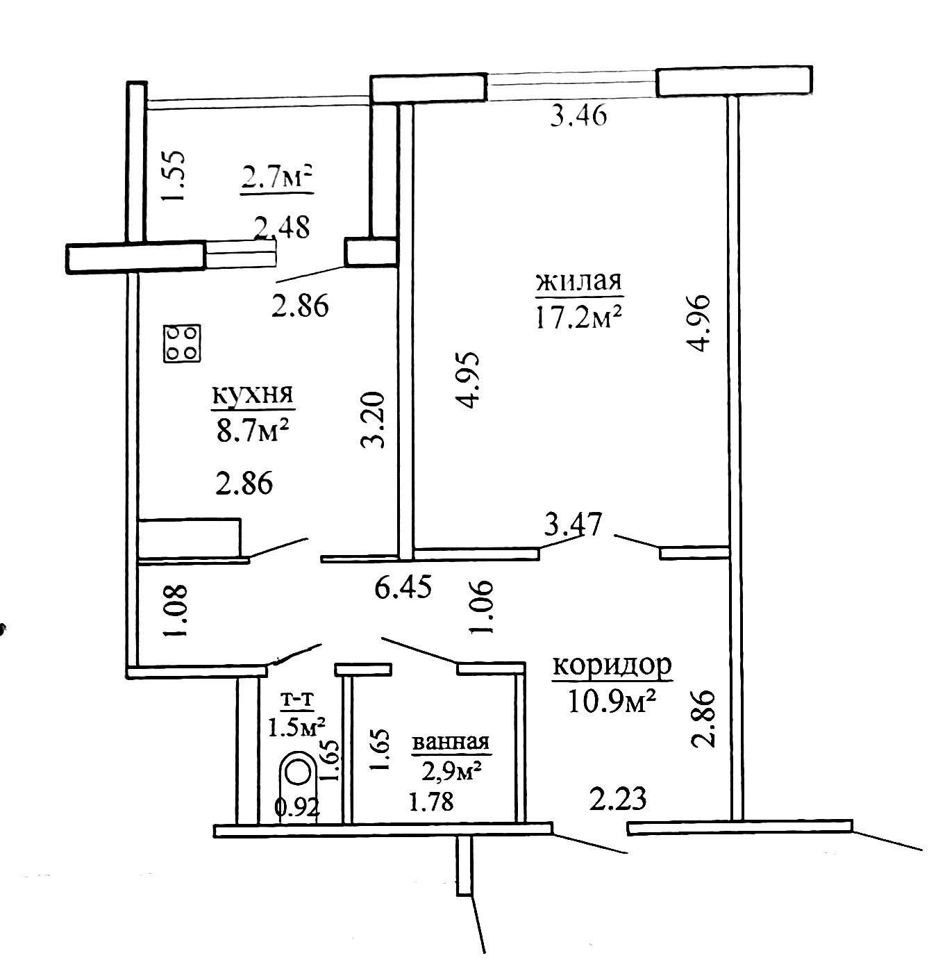 Площадь по СНБ 43,9 м2. Просторная утепленная лоджия 3,9 м2.