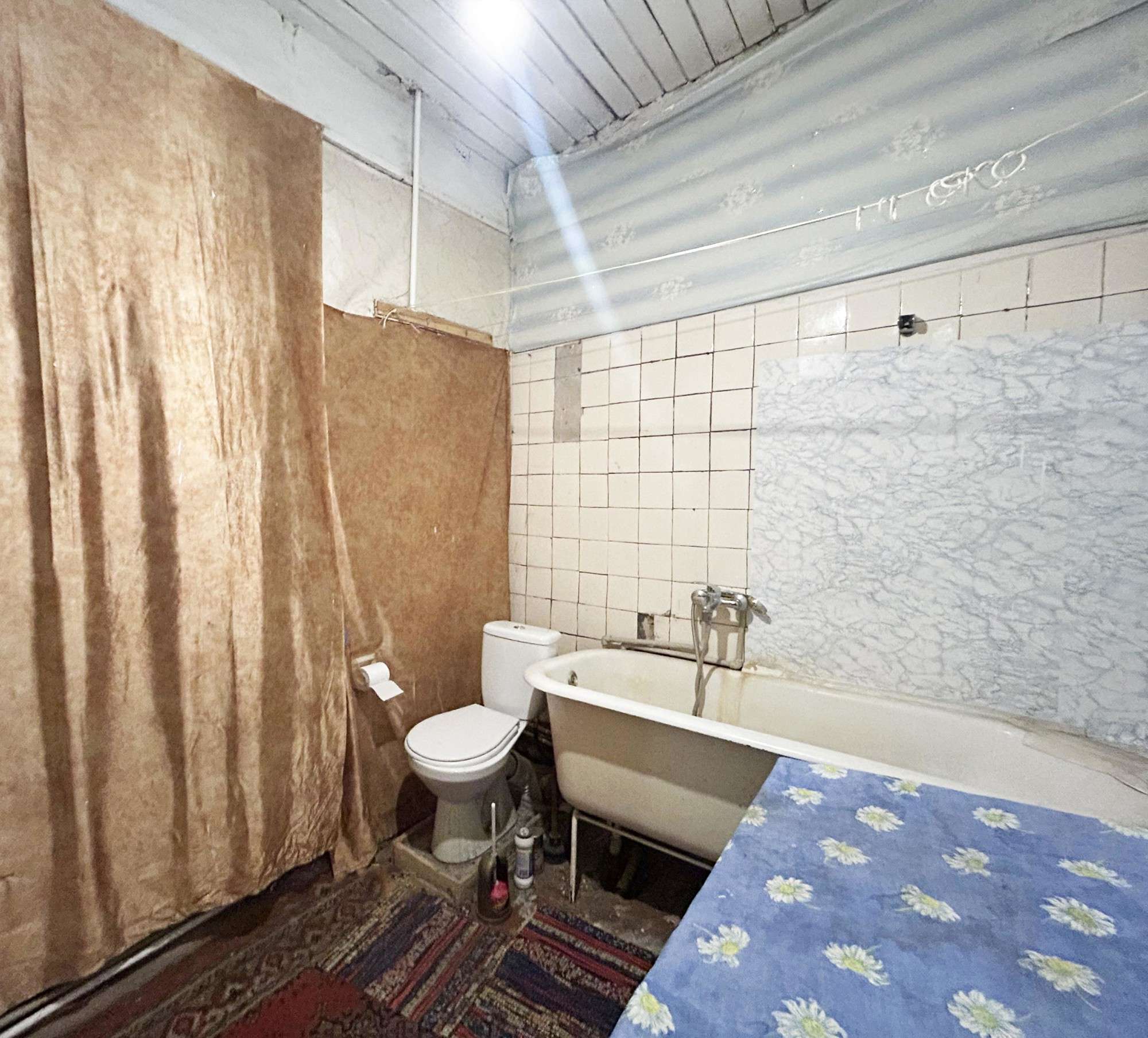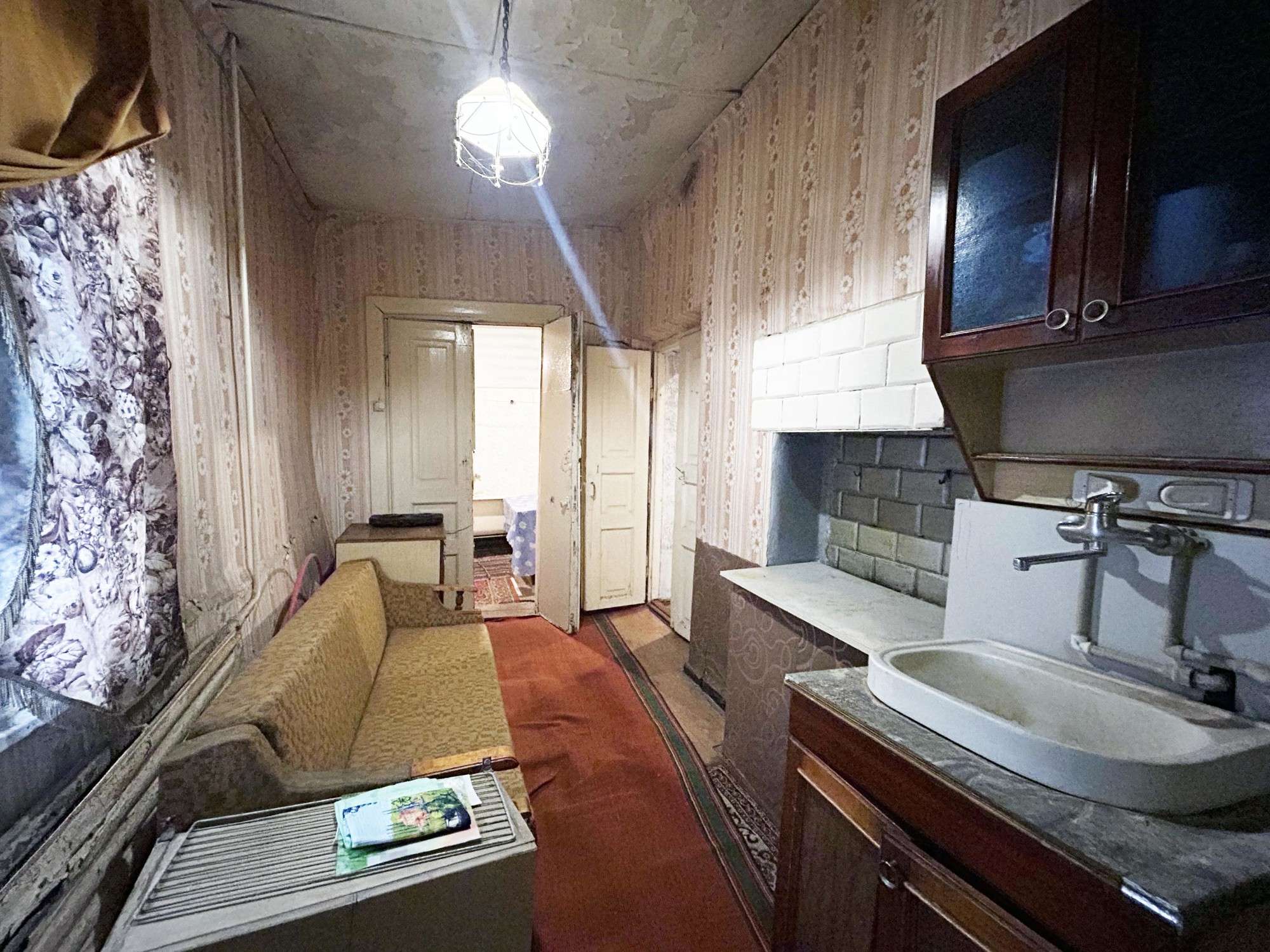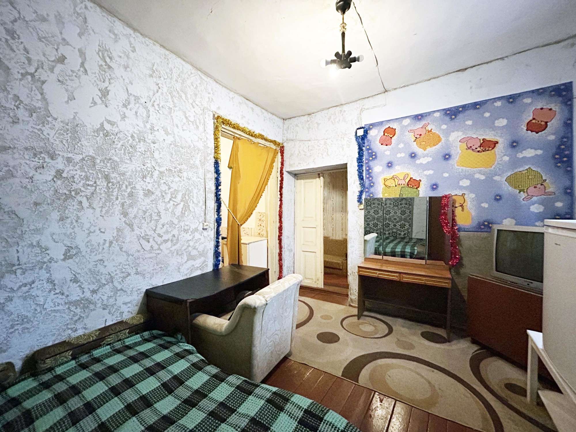 Квартира с отдельным входом в блокированном двухквартирном доме. В жилом состоянии, под ремонт. Двойные деревянные окна, дощатые полы, стены оштукатурены. Сохранена печь. Отопление, водоснабжение, канализация - центральные. Квартира состоит из дощатых сеней, кухни, совмещенного санузла и двух комнат, одна из которых проходная. Высокие потолки – 3,35 м.