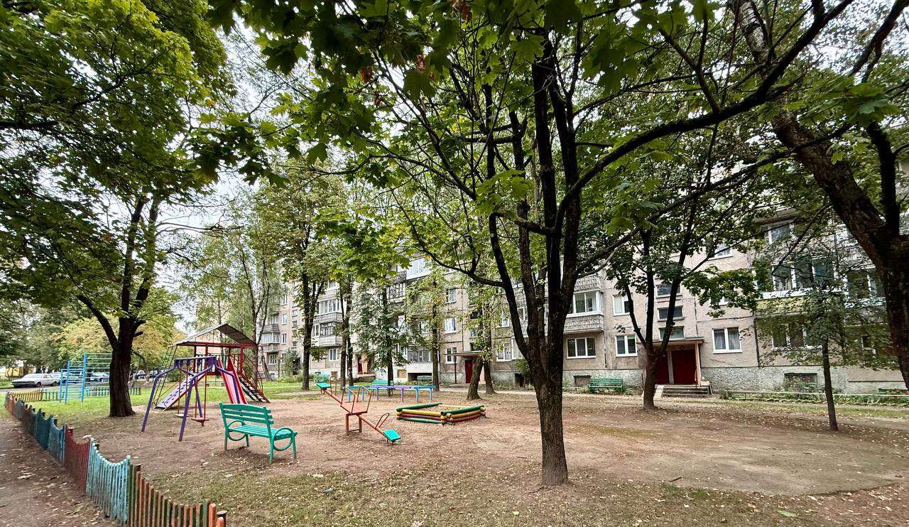 Просторный зеленый двор, большая детская площадка, и стоянка на большое количество парковочных мест.