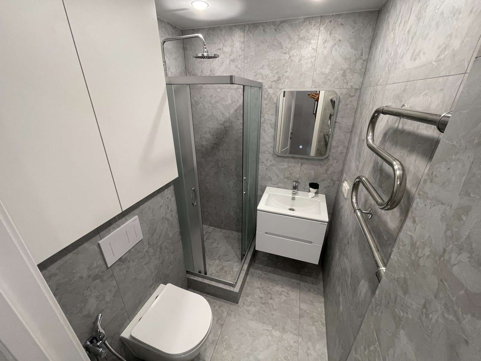 - в ванной инсталляция, гигиенический душ, душевой уголок, подвесной умывальник, зеркало с подсветкой, потолочный диффузор с выведенной клавишей включения