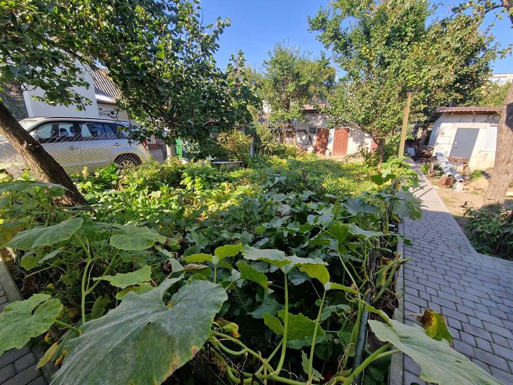 На участке построен сарай. Дорожки вымощены декоративной плиткой.