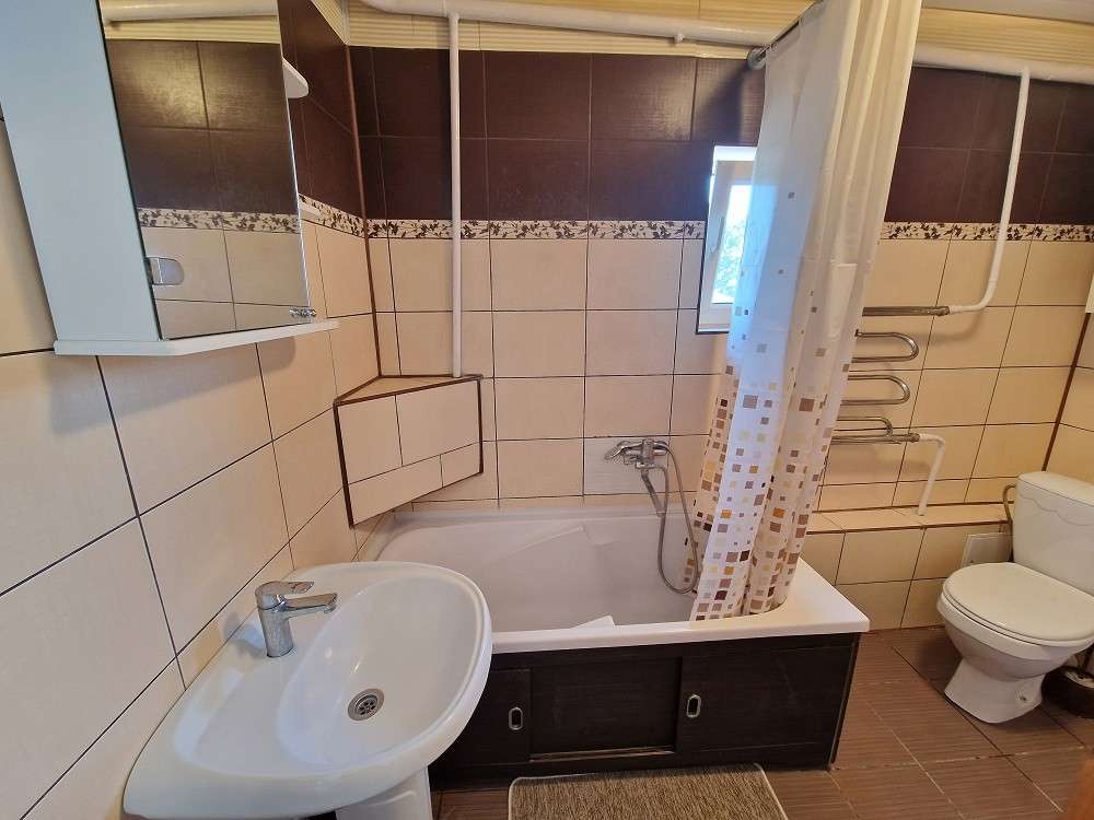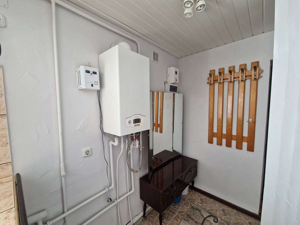 Все коммуникации заведены в дом. Канализация центральная, разведена под фундаментом. Отопление – двухконтурный газовый котёл. Материал полов –¬ ламинат, плитка. Санузел совмещен, облицован плиткой. Оконное остекление осуществлено энергосберегающими стеклопакетами. В квартире есть погреб.