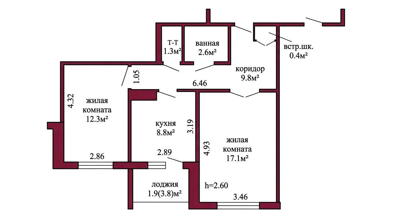 Параметры квартиры: общая площадь- 52,3 кв м жилая площадь- 29,4 кв м, кухня-8,8 кв м.
