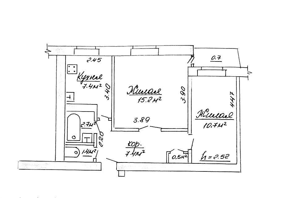 Общая площадь – 45,3 кв. м., жилая – 25,9 кв. м., кухня – 7,4 кв. м.
