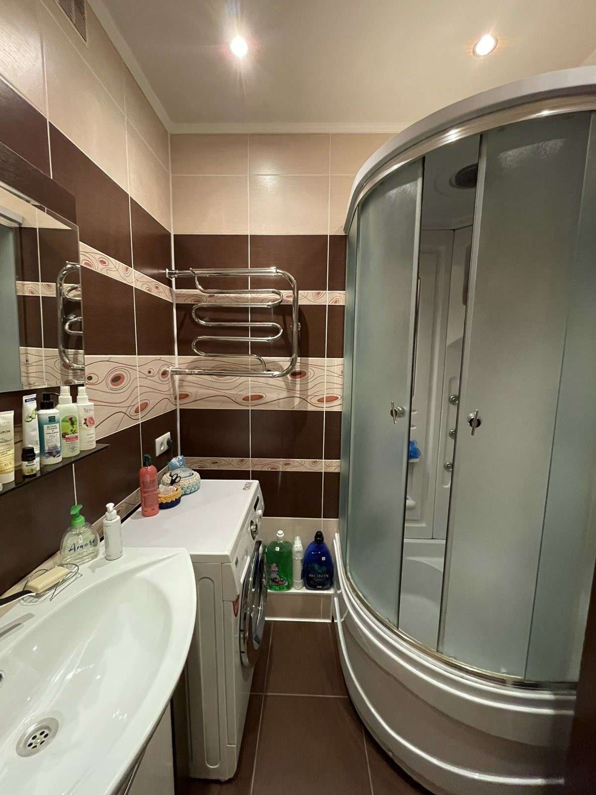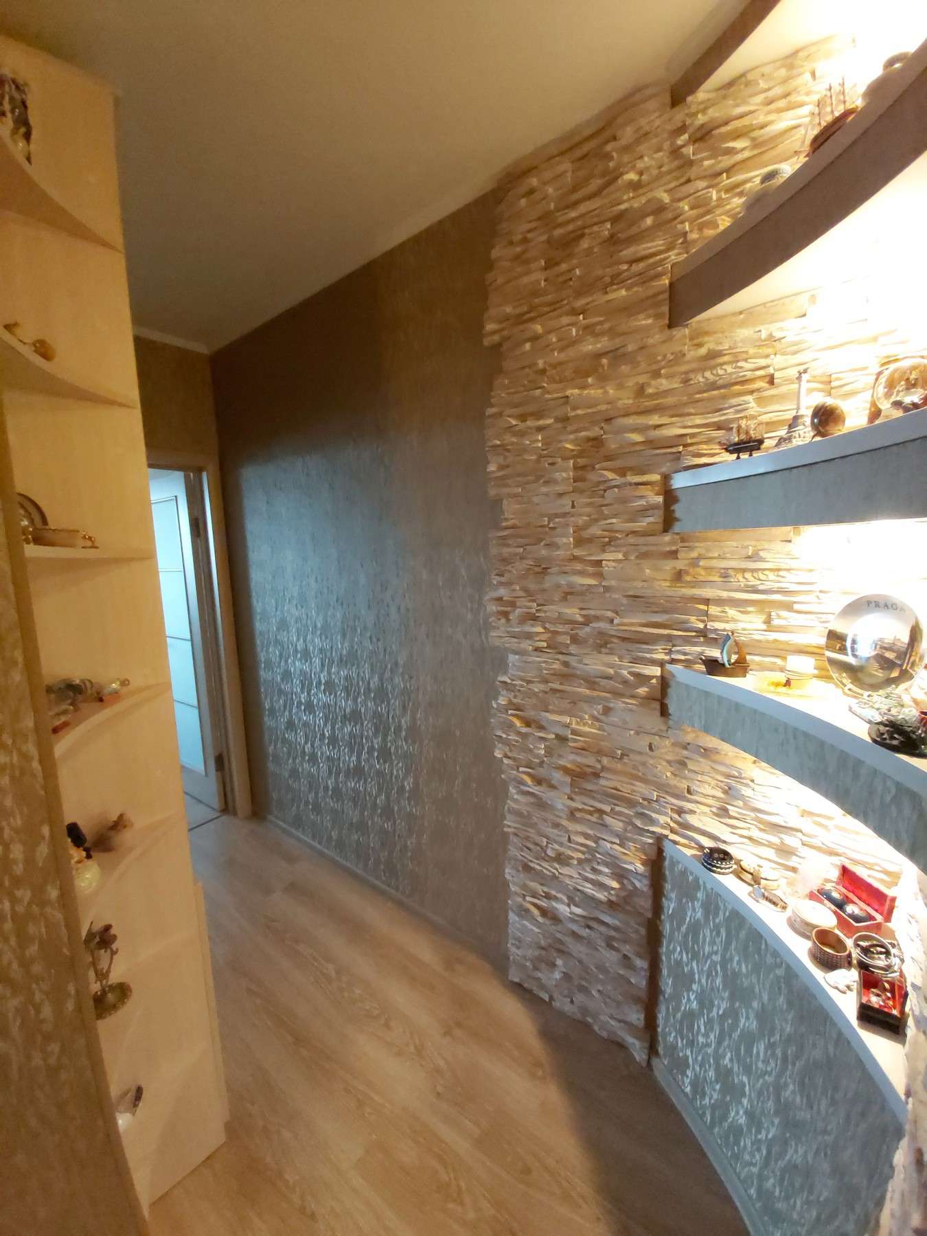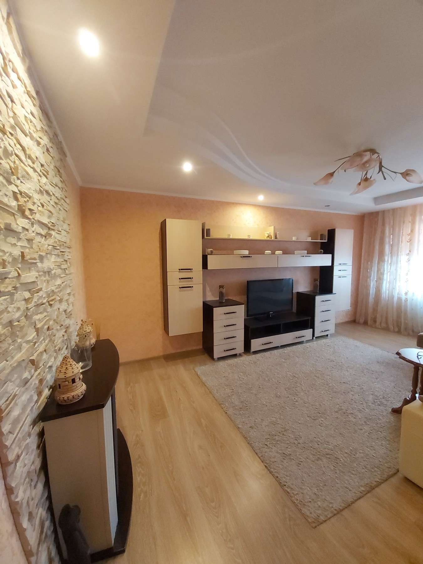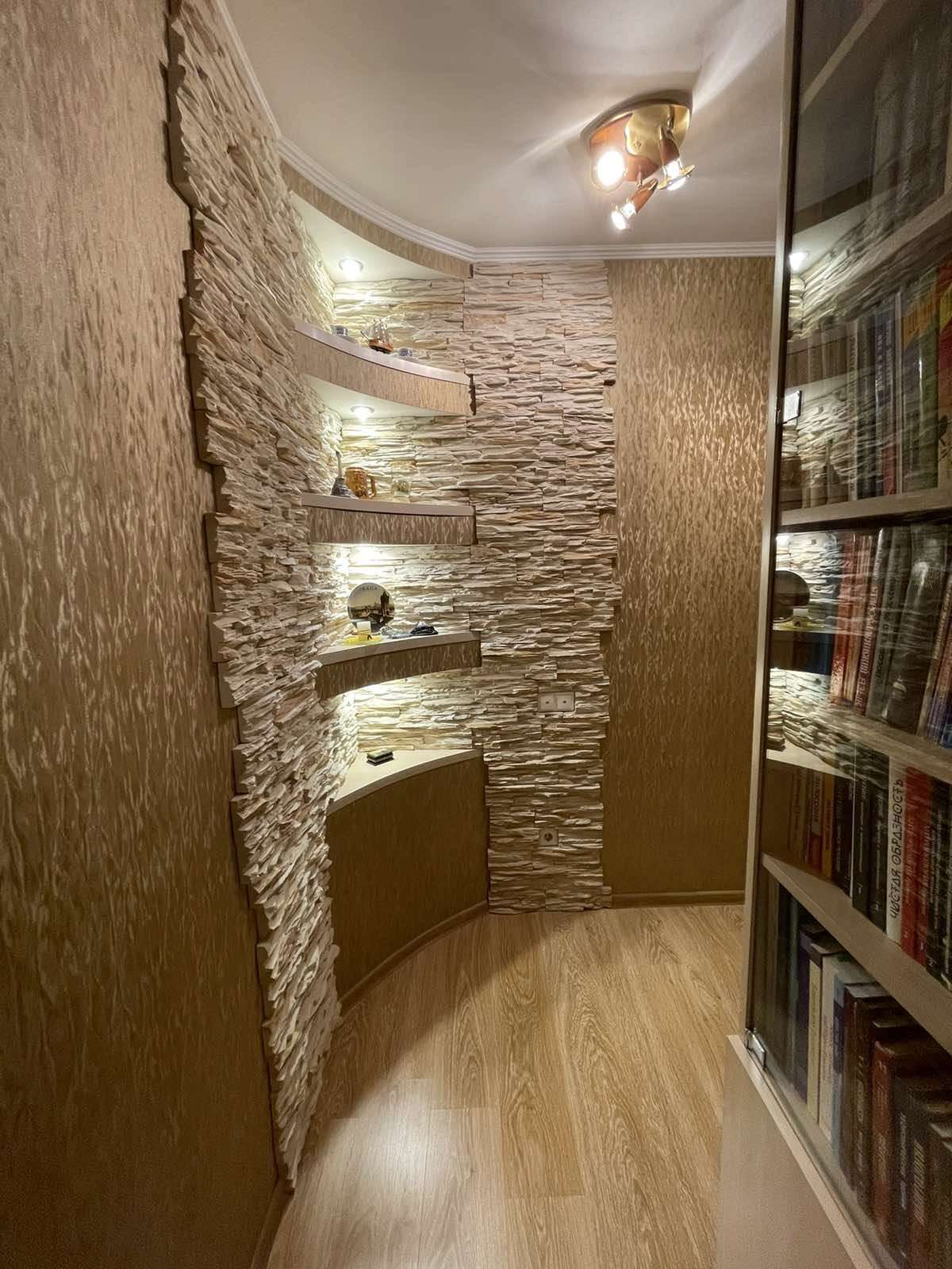 В квартире выполнен ремонт из высококачественных дорогих материалов в тёплых натуральных тонах: на полу ламинат, на кухне и в санузлах — керамическая плитка, стены отделаны декоративным камнем. Электрокамин добавляет не только душевного тепла. Утеплённая и застеклённая лоджия - дополнительное пространство для релакса.