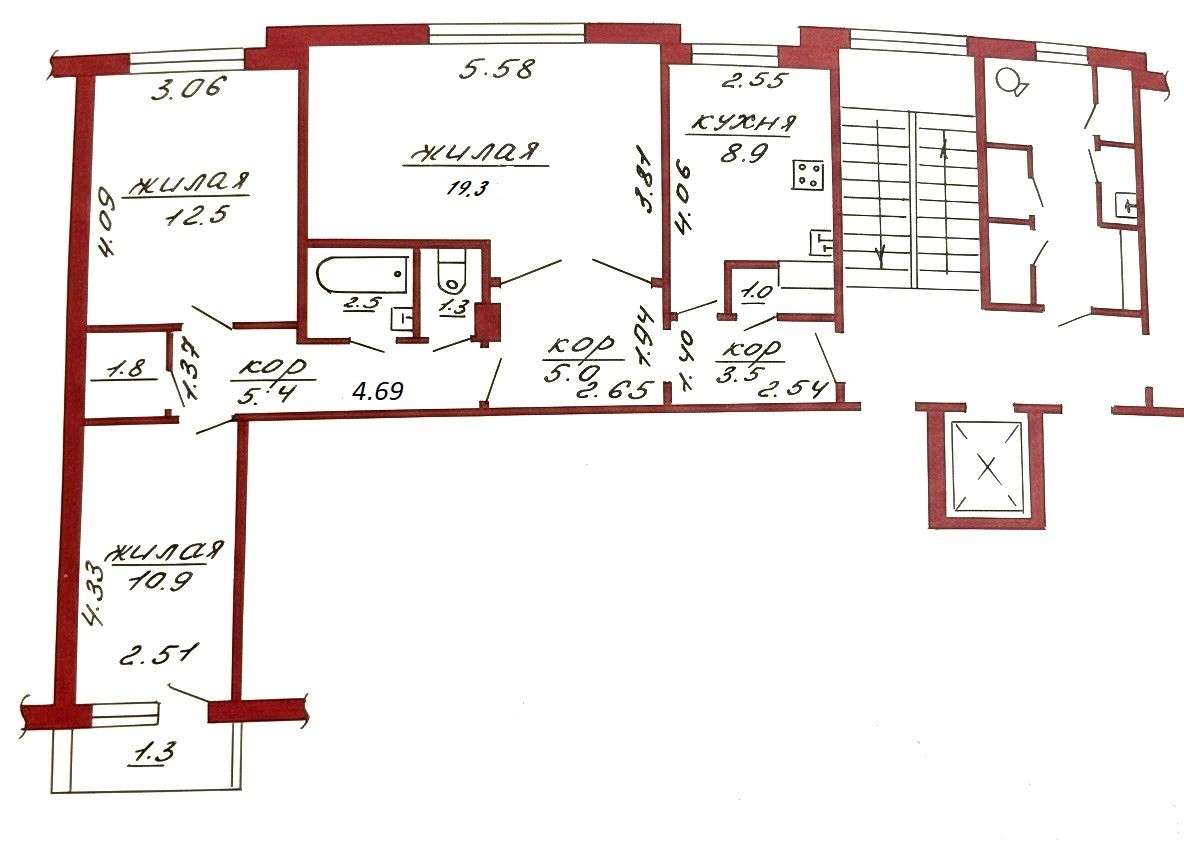 Планировка: три комнаты (две комнаты 12.5 и 10.9м2 — на разные стороны, одна большая - 19,3м2).