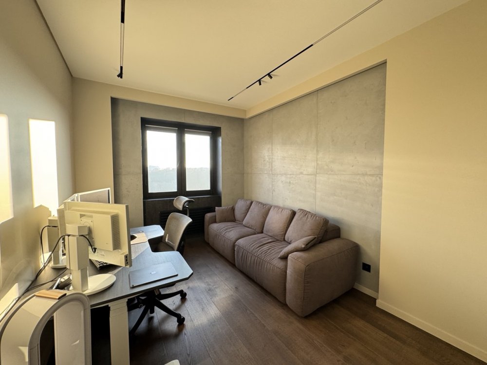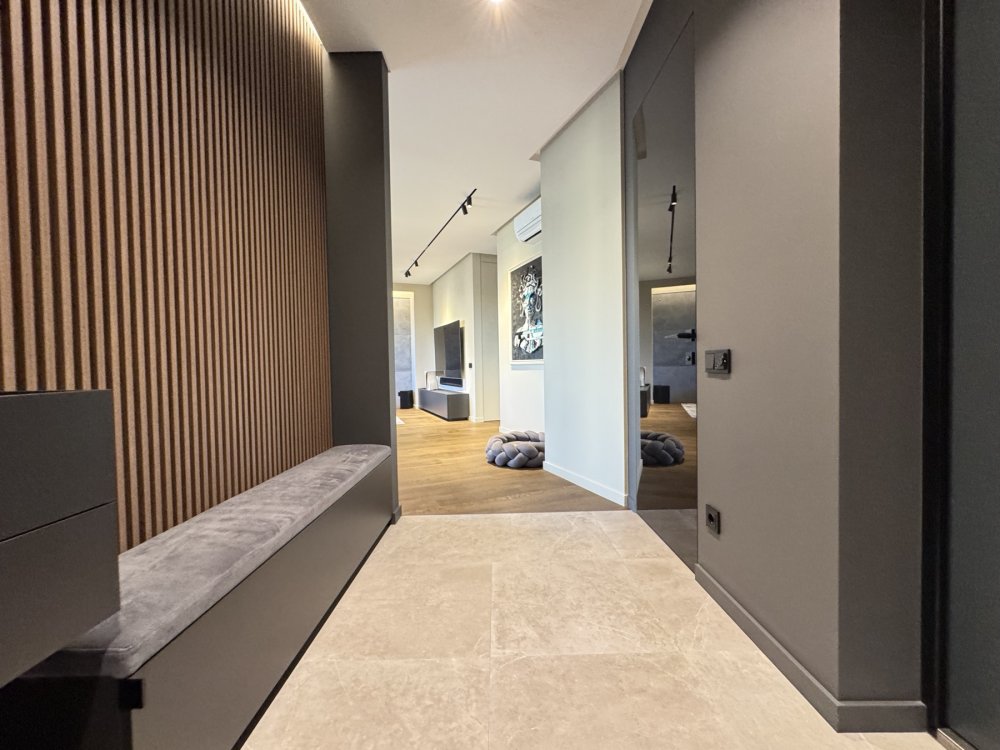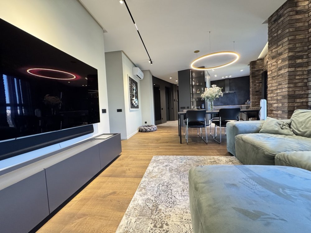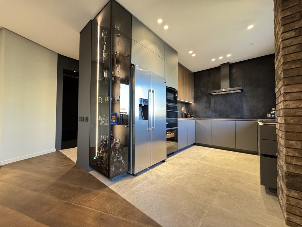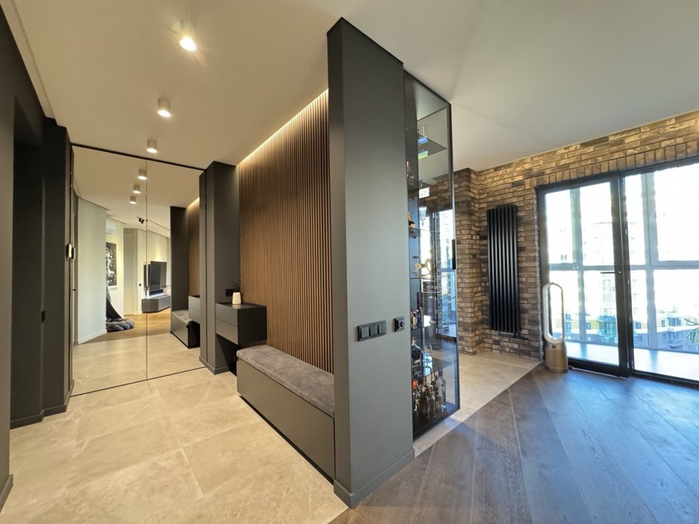 Ремонт выполнен согласно дизайн-проекта исключительно из материалов премиум класса. Встроенная мебель во всей квартире изготовлена на заказ из высококачественных материалов по индивидуальным эскизам. Кухня со встроенной техникой немецких производителей европейской сборки.