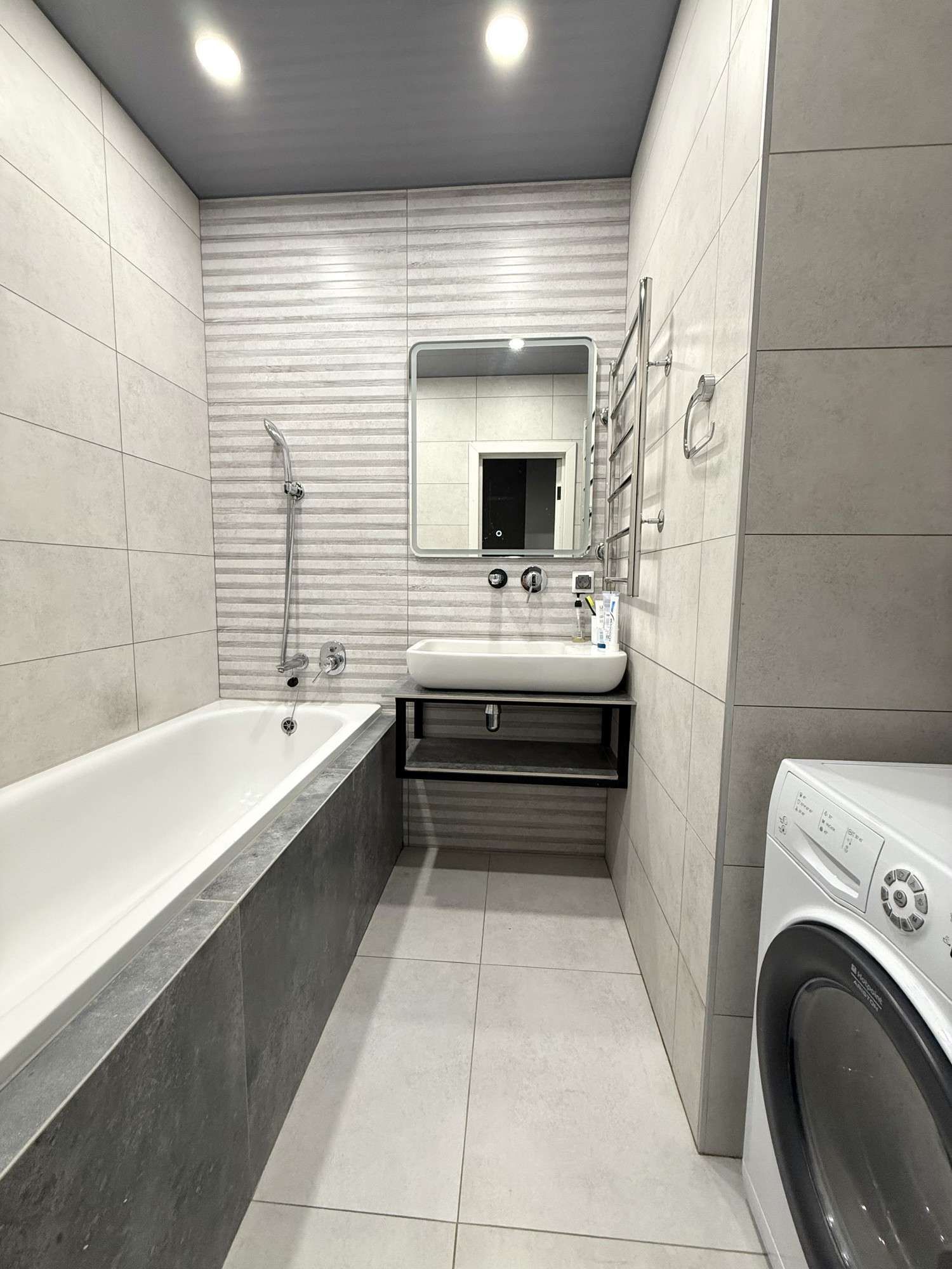 В спальне оборудована собственная душевая кабина, есть отдельная гардеробная с продуманной системой хранения. Санузел и ванная комната облицованы качественной плиткой, установлена современная сантехника и вместительная стиральная машина. Входная дверь оборудована электронным замком ― безопасность на высшем уровне.