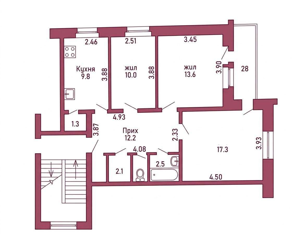 Квартира имеет общую площадь 70,0 м², жилую-40,9 м², три комнаты-10,0 м², 13,6 м², 17,3 м², просторная кухня-9,8 м², большая прихожая 12,2 м², с гардеробной комнатой (из кладовой) 3,4 м², раздельный санузел (туалет-1 м², ванная комната-2,5 м²), большая лоджия (2,8 м²) имеет два выхода-из гостиной и из одной из спальных комнат. Высота стен 2,5м.