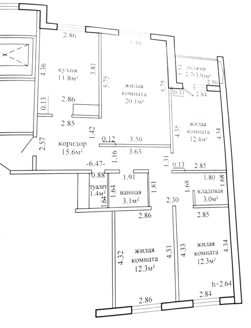 Высота потолков - 2,64 м.