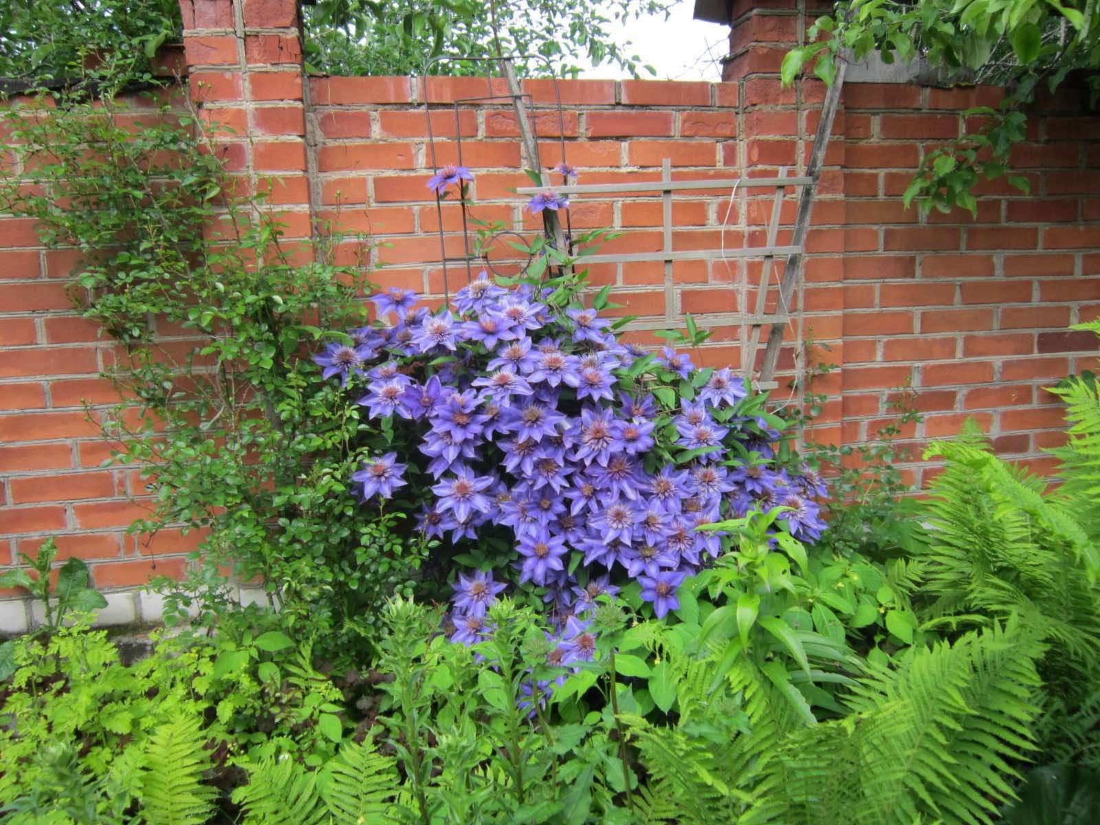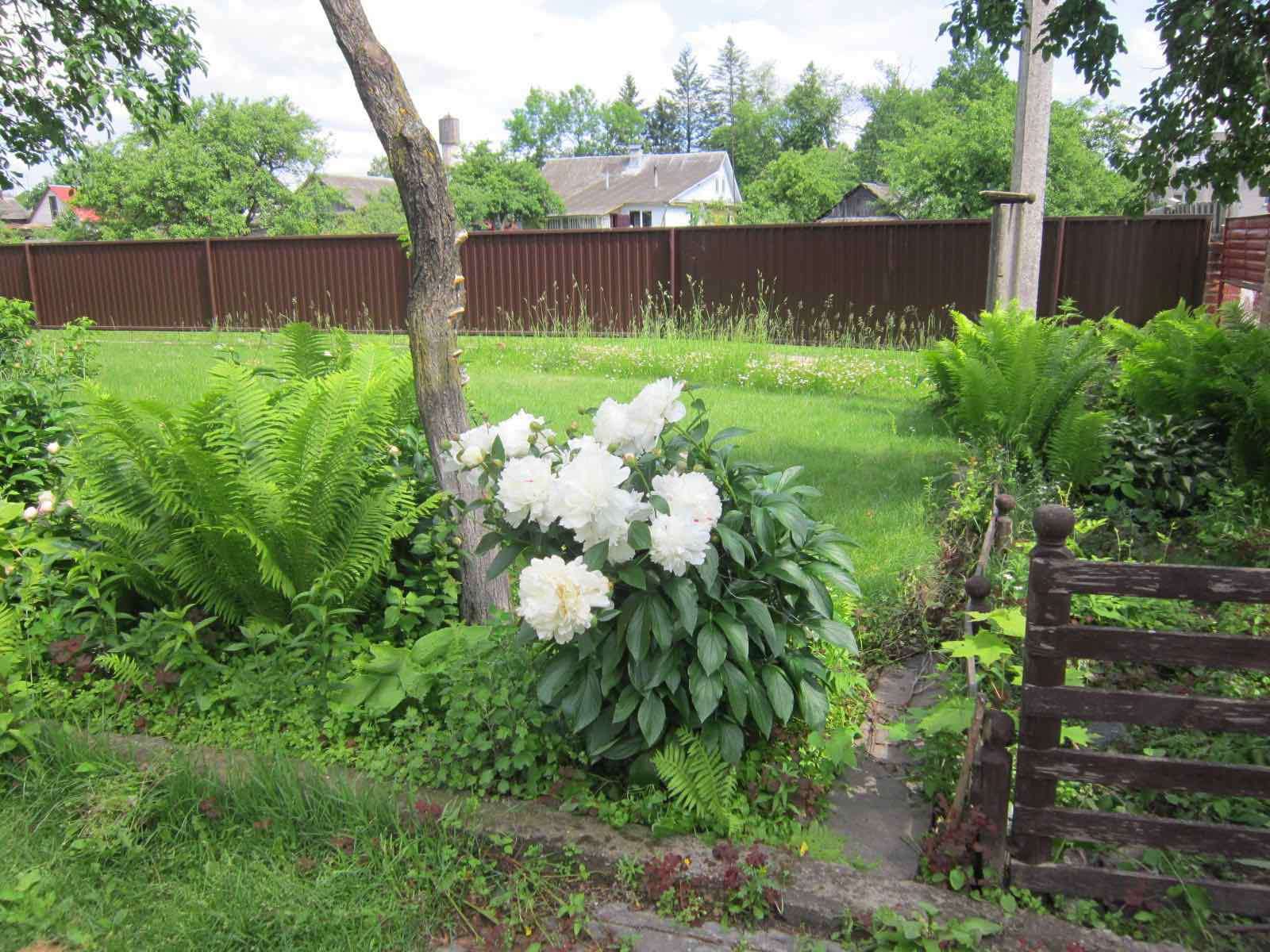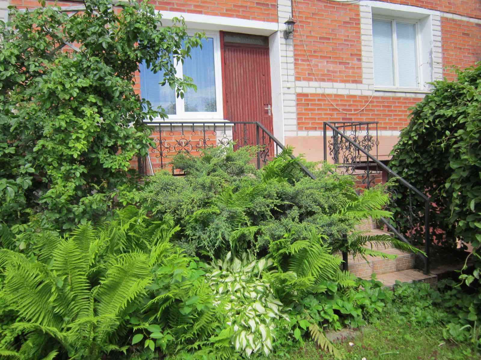 Земельный участок. Забор—одна часть из красного кирпича, вторая часть из сетки, остальная металлопрофиль. 2 мусорных бака. Забор оплетен девичьим виноградом и хмелем. Четыре 35-летних высоких туи, яблоня, груша, вишня, хоста, можжевельник, роза-плетущаяся, лимонник лекарственный, 2 сумахи, газон, цветы: ландыши, фиалка, маргаритки. Двор выложен тратуарной плиткой. Во дворе находится гараж с ямой и 2 подсобных помещения