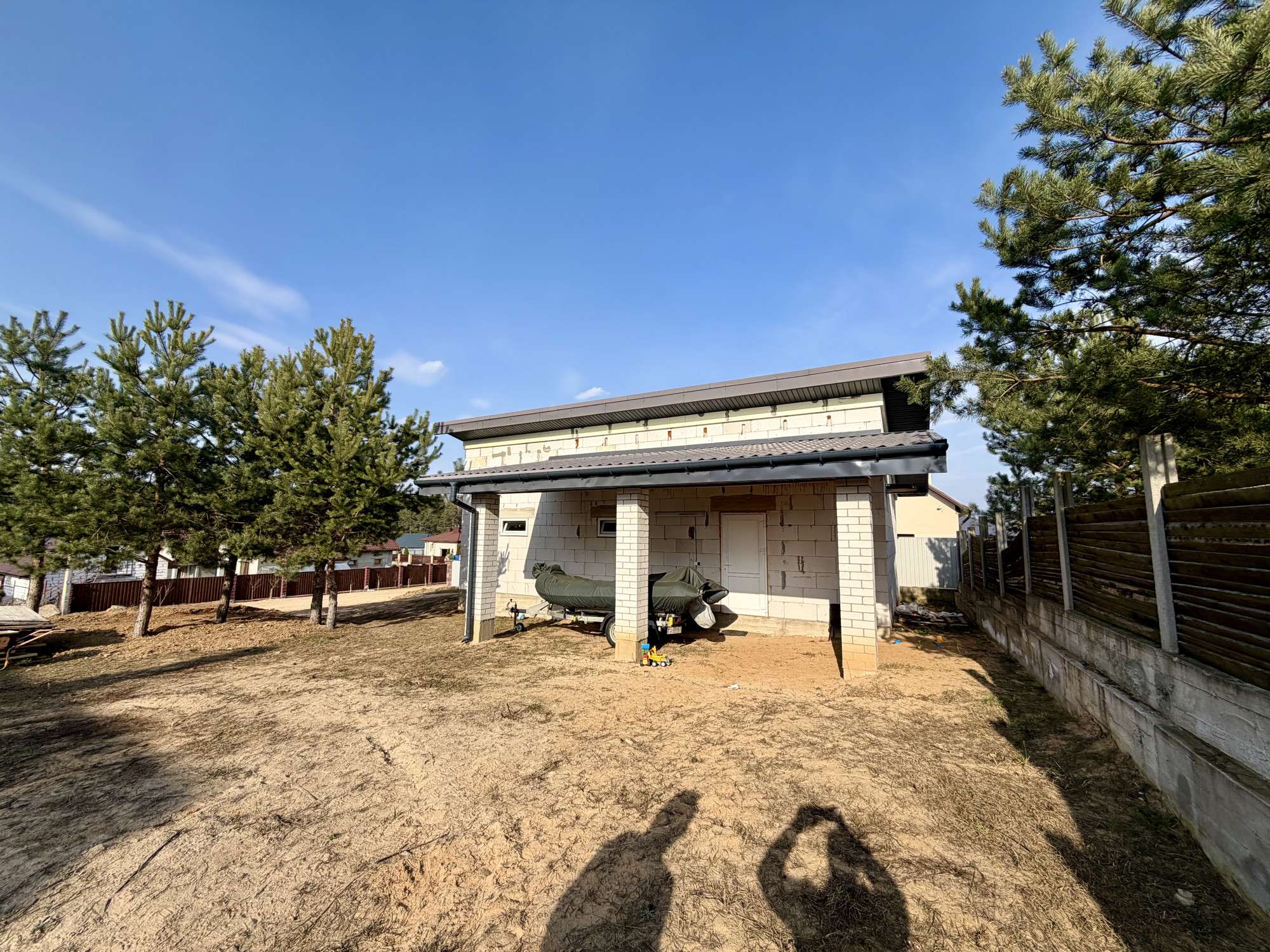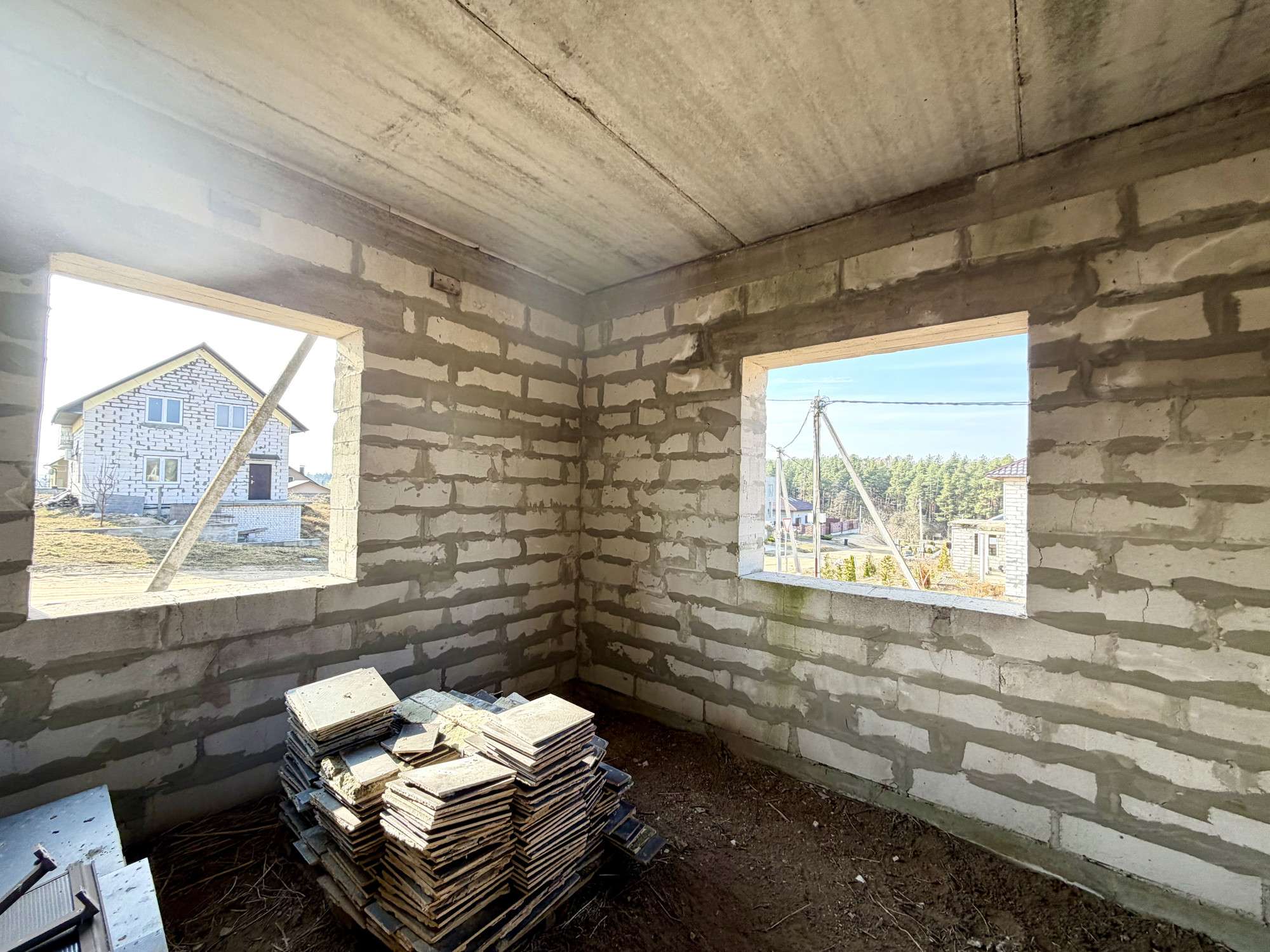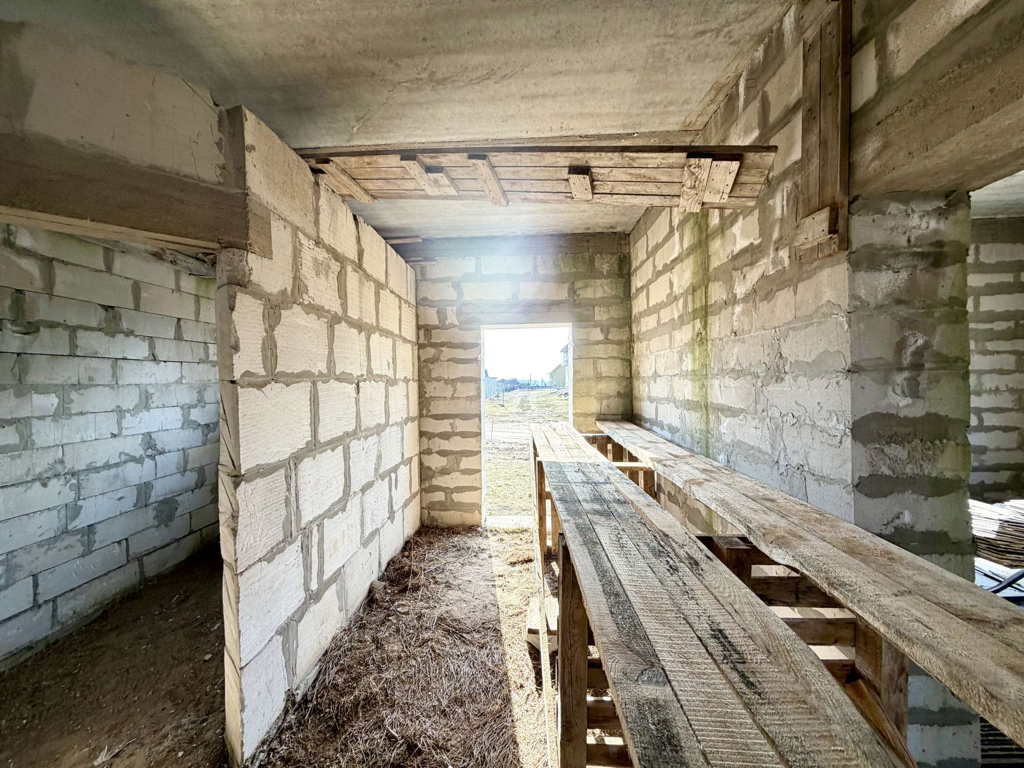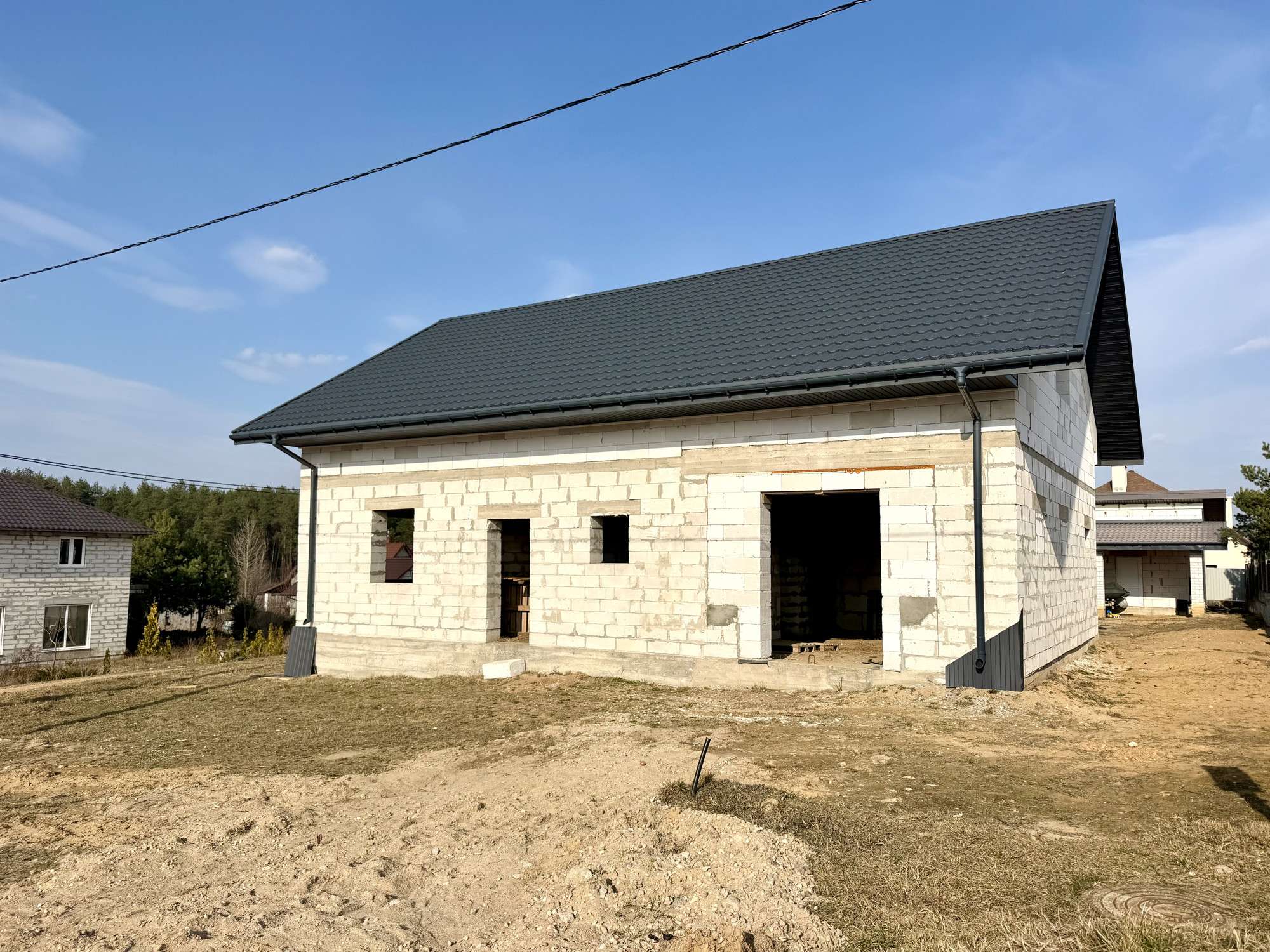 Общая информация о строении: незавершённое законсервированное капитальное строение представляет собой двухэтажный дом, общей площадью 200 кв.м. Проектом предусмотрена эффективная планировка: 1-ый этаж - просторная кухня-34 м2, гостиная-29,6 м2, топочная и гостевой санузел. На втором этаже предусмотрены 3 жилые комнаты (14,8м2, 14,6м2, 35,3м2) санузел и просторный холл. Фундамент – монолит. Стены – газосиликатный блок 40см. Перекрытия — ж/б плиты. Крыша – металлочерепица бельгийского производства. Частично возведены перегородки.