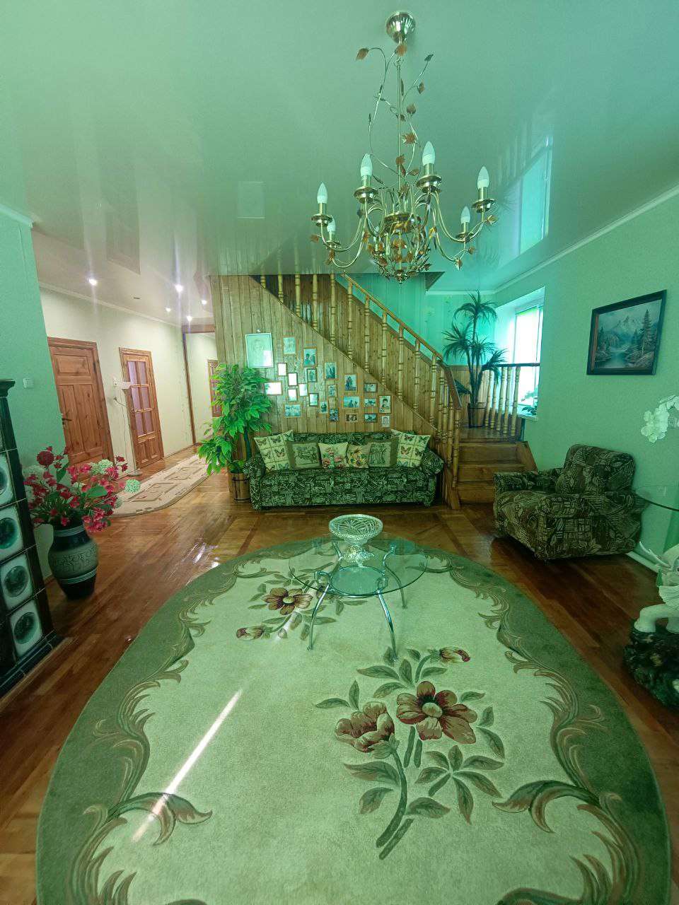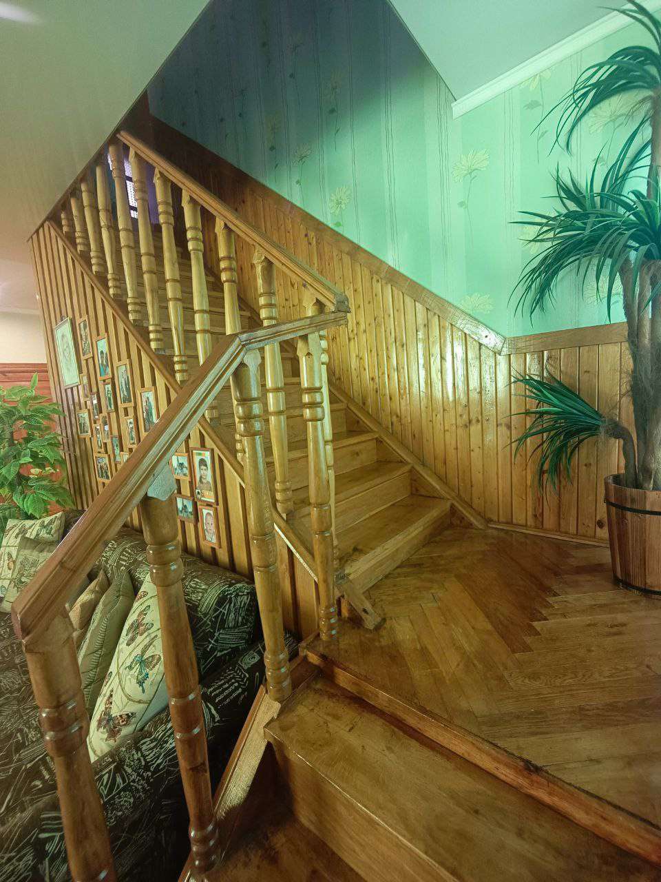 В доме имеется технический этаж, где расположены кладовая, котельная и гараж с ямой. На полу в доме уложен паркет, окна выполнены из ПВХ, натяжные потолки, установлены деревянные межкомнатные двери.