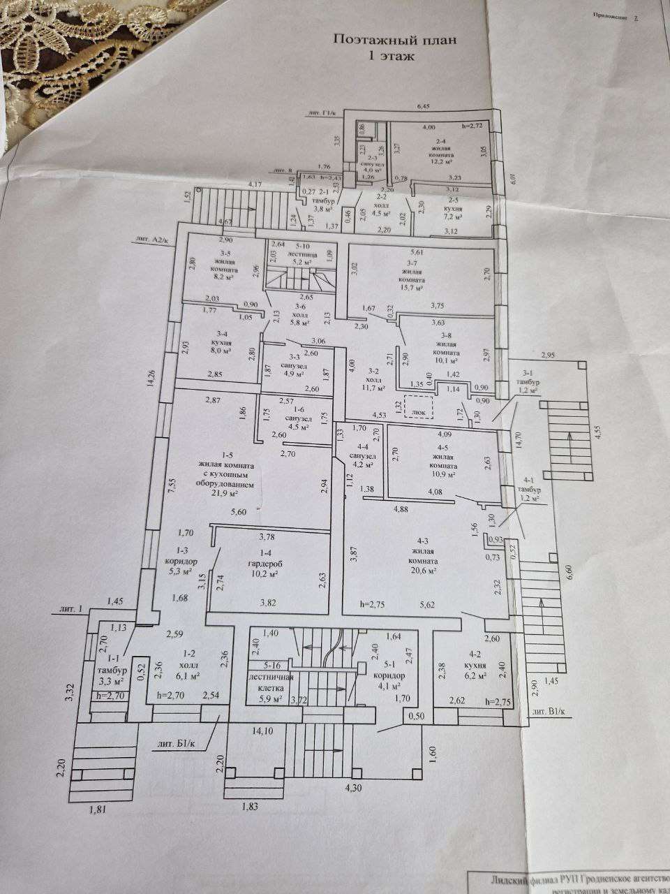 - на первом этаже размещены 4 обособленные жилые квартиры. В каждой квартире предусмотрена кухня , санузел и жилые комнаты. У каждой квартиры имеется отдельный выход во двор. Коммуникации все введены и разведены по дому .