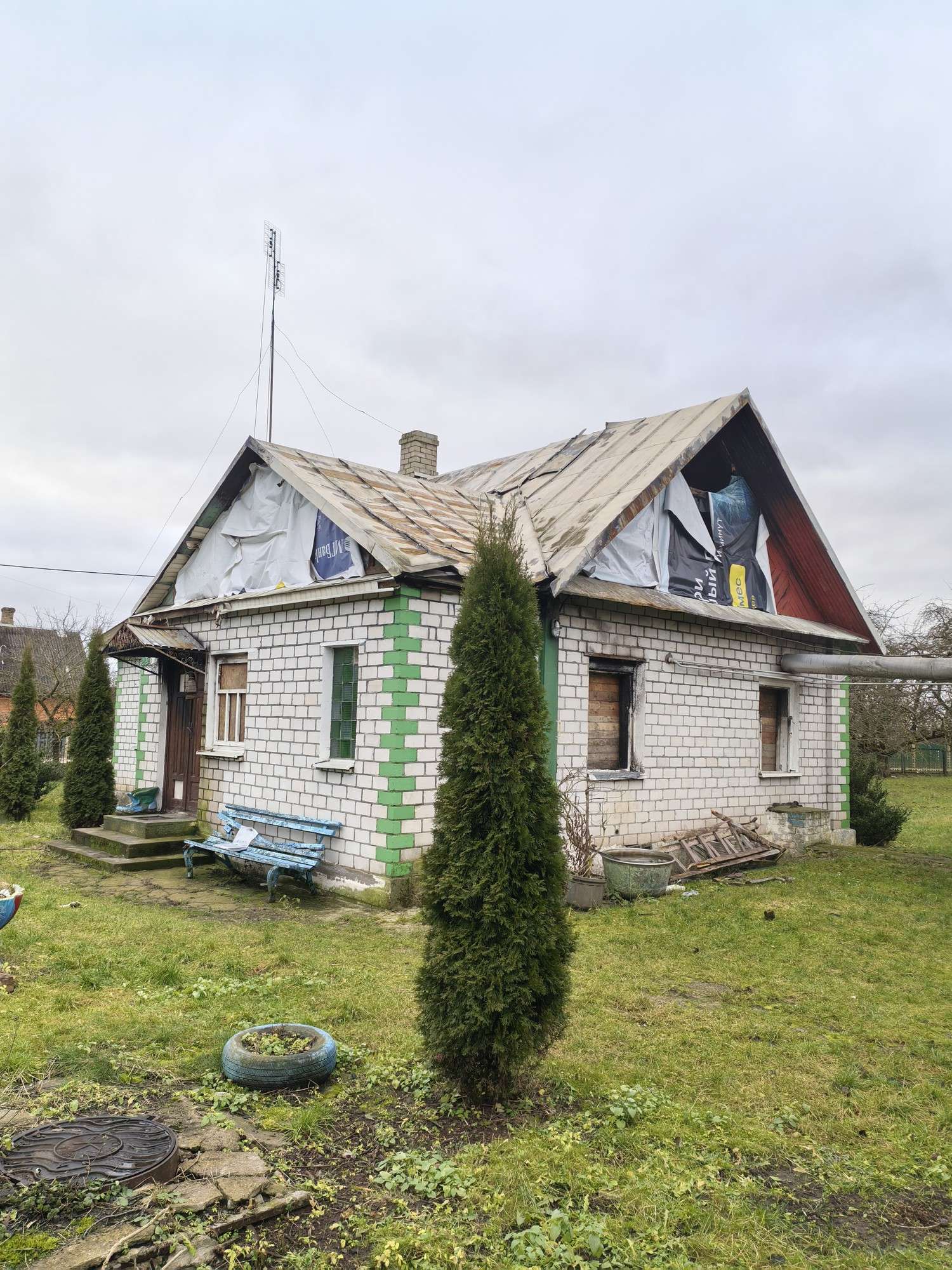 На участке 25 соток расположен дом (после пожара), жилая летняя кухня на газовом отоплении, гараж, хозпостройки, колодец с гидрофором. Центральное водоснабжение, канализация местная, 220V. Дополнительно 5 соток в аренде.