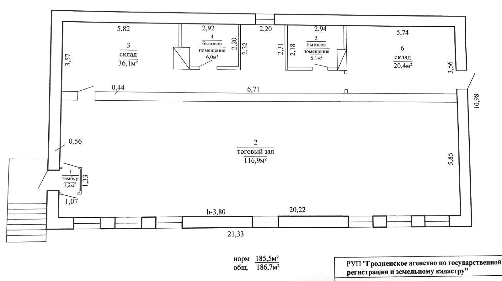 Кирпичное строение площадью 186.7 м2, нормируемая 185.5 м2 .